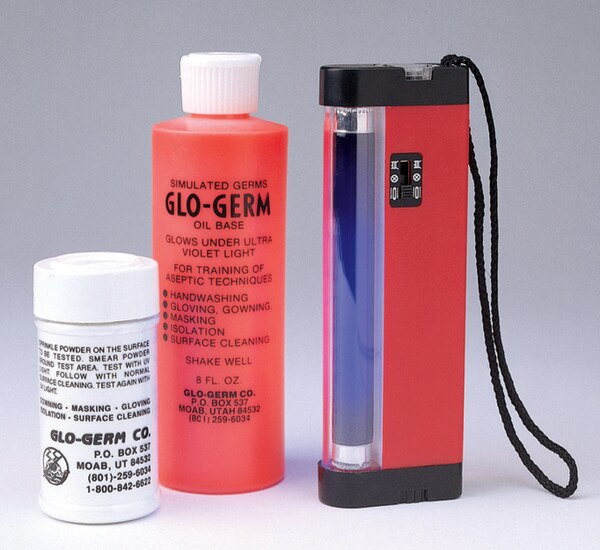 The "germs" in the Glo-Germ kit are tiny plastic particles that glow when exposed to ultraviolet light. Participants apply the Glo-Germ powder or oil to hands or other surfaces. After normal washing procedures, remaining "germs" can be viewed using an ultraviolet flashlight.