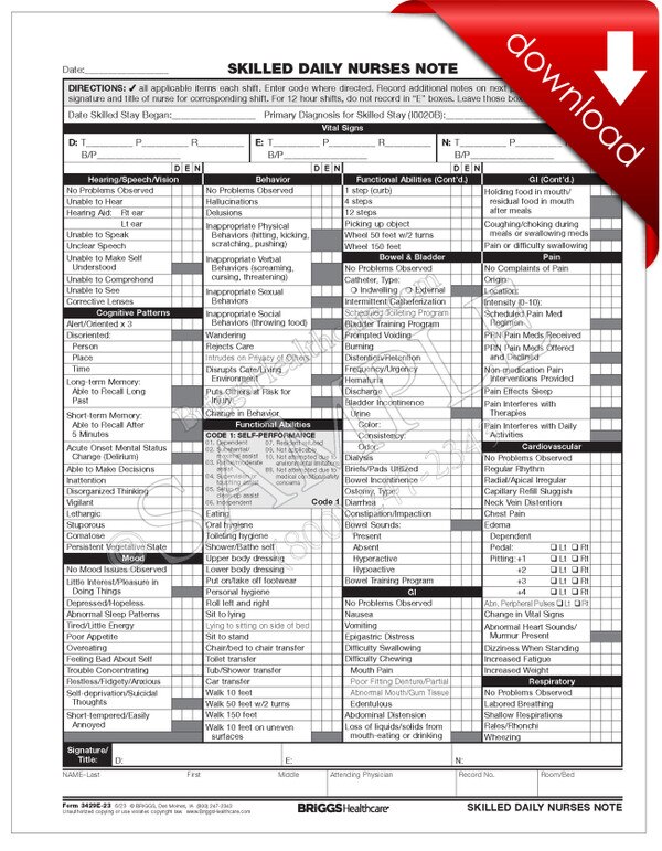 Document the skilled care provided 24/7 with Briggs Skilled Daily Nurses Note.